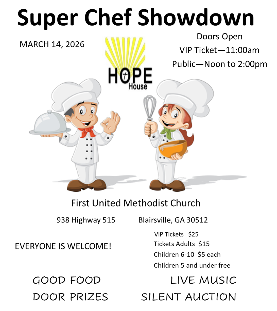 Mar 14 Super Chef Showdown Saturday, March 14, 2026 11:00 AM 2:00 PM First United Methodist Church (map) Google Calendar ICS Register to Sponsor, Donate, or be a Super Chef Team View Event →